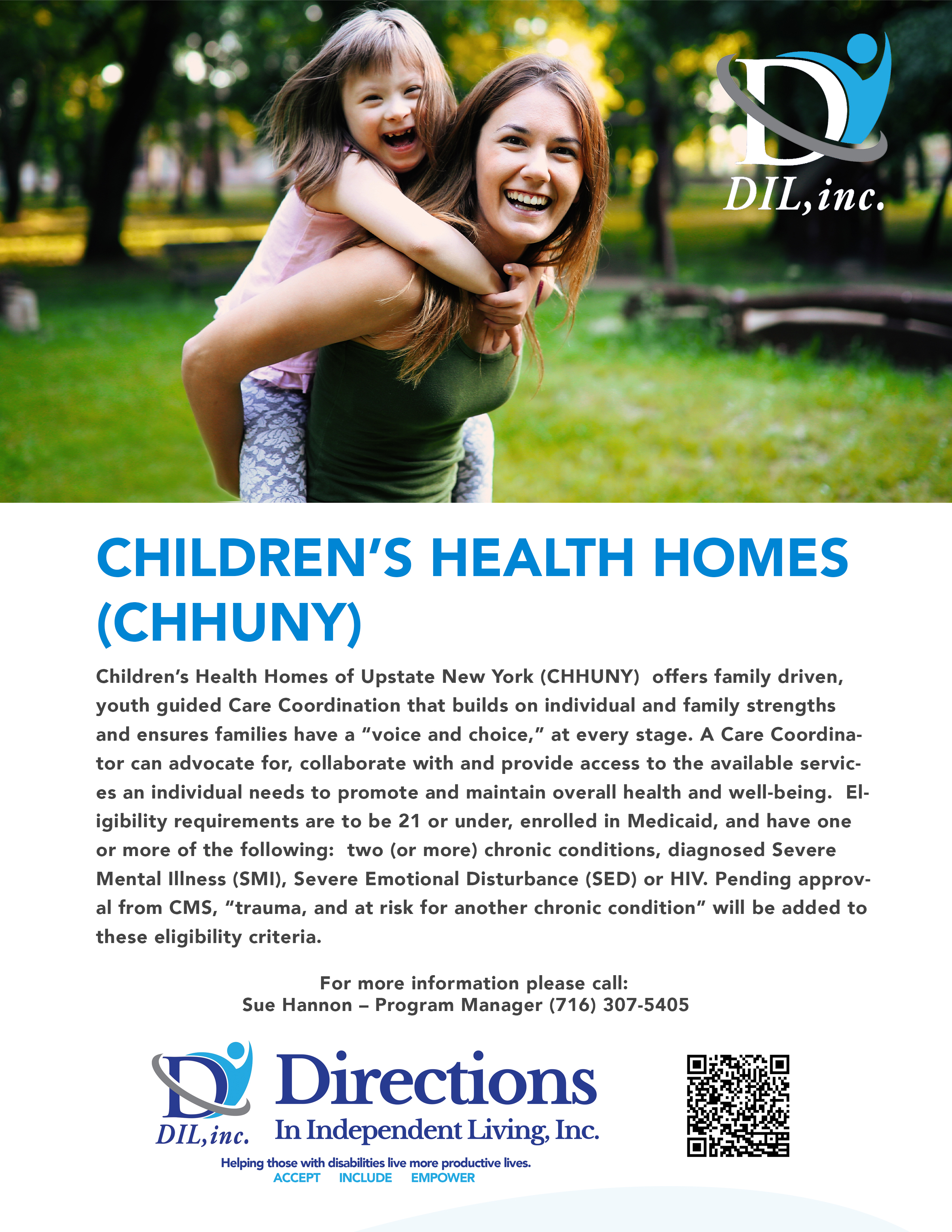 Children’s Health Homes of Upstate New York (CHHUNY) offers family driven and youth guided Care Coordination that builds on individual and family strengths and ensures families have a “voice and choice” at every stage. A Care Coordinator can advocate, collaborate, and provide access to the available services an individual needs to promote and maintain overall health and well-being. Eligibility requirements are to be 21 or under, enrolled in Medicaid, and have one or more of the following: two (or more) chronic conditions, diagnosed Severe Mental Illness (SMI), Severe Emotional Disturbance (SED) or HIV/AIDS. Pending approval from CMS, trauma, and at risk for another chronic condition will be added to these eligibility criteria.