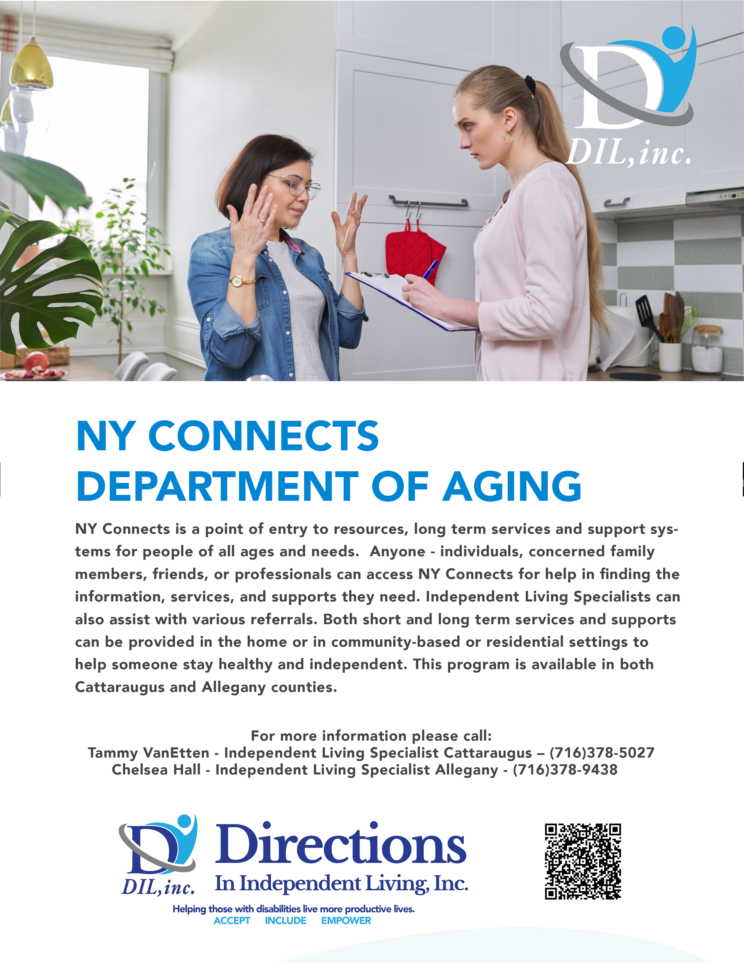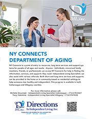 NY Connects is a point of entry to resources, long term services and support systems for people of all ages and needs. Anyone - individuals, concerned family members, friends, or professionals can access NY Connects for help in finding the information, services, and supports they need. Independent Living Specialists can also assist with various referrals. Both short and long term services and supports can be provided in the home or in community-based or residential settings to help someone stay healthy and independent. This program is available in bothCattaraugus and Allegany counties.