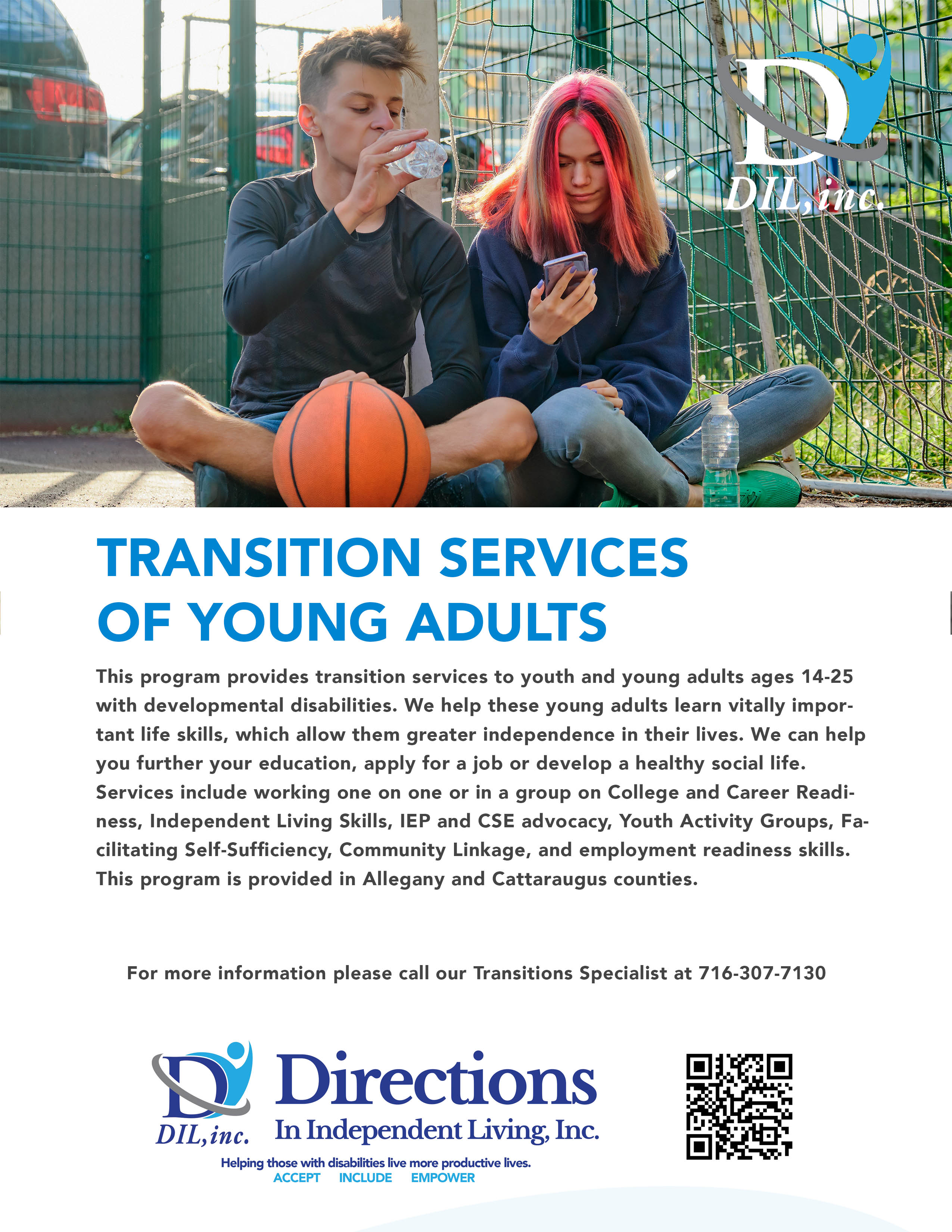 This program provides transition services to youth and young adults ages 14-25 with developmental disabilities. Services include working one on one or in a group on higher education, independent living skills, and employment readiness skills. This program is provided in Allegany and Cattaraugus counties.